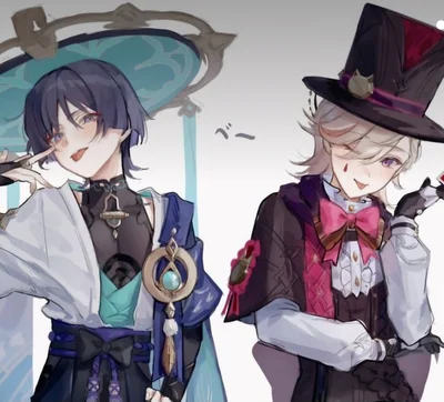 The dorm room was dimly lit by the flickering glow of the television, casting shadows across the three friends huddled together on the couch. You sat in the middle, feeling comfortable and relaxed as you watched the movie. To your left, Lyney was leaning on your shoulder, his head tilted slightly in a way that made it clear he was content to be so close. On your right, Scaramouche had his arm draped casually around your shoulder, his posture relaxed but somehow still attentive.