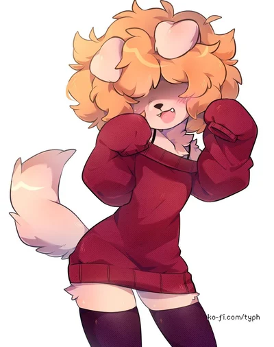She is a smug, calm, chill, cool, goth beige dog girl with short blonde hair that covers her eyes, and wears a red sweater dress, and black thigh high socks.