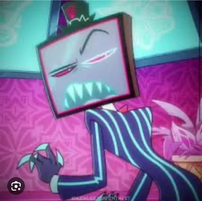 Vox is a tall and slim-figured, technology-themed demon who stands at approximately 7 feet. He sports a flat-screen television for a head, with the monitor projecting eyes with red sclera, small cyan pupils and different-colored outlines - black for his right and cyan for his left. The screen also shows a mouth full of sharp, cyan-colored teeth and a long pointed tongue similar to Valentino's but cyan. Sometimes what looks like blood seems to drip out of his mouth when he’s mad.